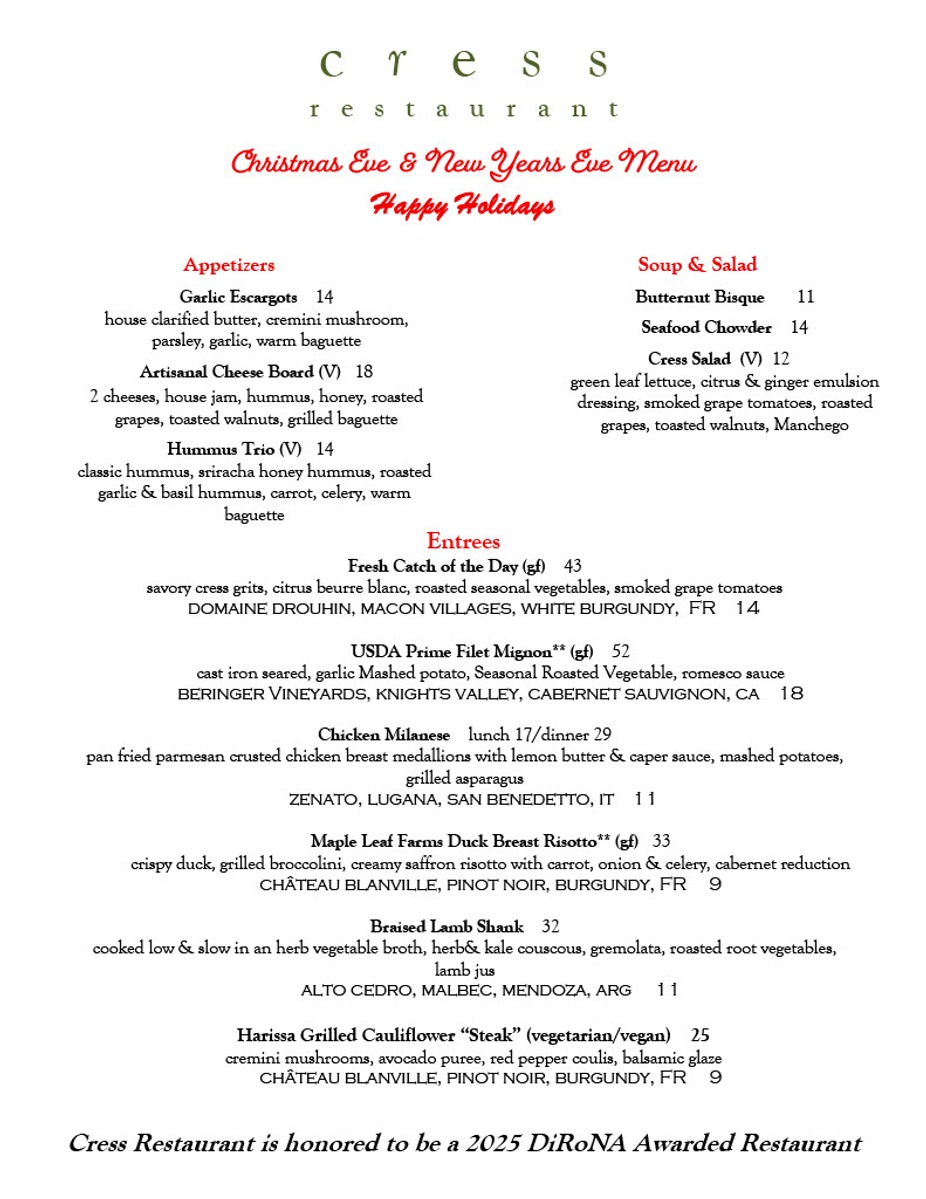 This New Years Eve enjoy dinner from our limited a la carte menu. Ring in the new year here a t Cress. Book you table now.